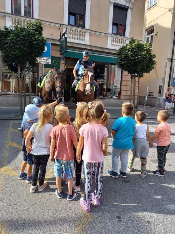 K sodelovanju pa nas je kot vrtec, ki je na tem področju že aktiven, povabila tudi Mestna občina Celje. Oddelki najstarejših otrok so bili vabljeni v mesto na Prešernov trg k pripravljenim aktivnostim za otroke. Ogledali so si zunanjost in notranjost Celebusa, razstavo vozil kot so bili nekoč, pripomočke za varno vožnjo, se igrali talne igre (ristanc, …). Poleg ostalih vsebin o prometu so spoznali tudi delo policistov ter imeli možnost od bližje spoznati in opazovati policijske konje.