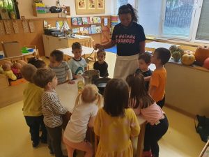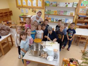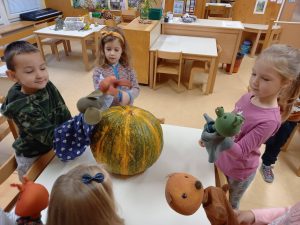 Razigrano smo poskrbeli tudi za vrtčevske kuharske mojstrovine. Po vsem vrtcu je zadišalo po mamljivih vonjavah … »Juha, ki iz buč se skuha« izpod marljivih prstkov otrok je bila v trenutku v njihovih trebuščkih. O njenem okusu so otroci pripovedovali tudi doma, prav tako o knjigi z istim naslovom.