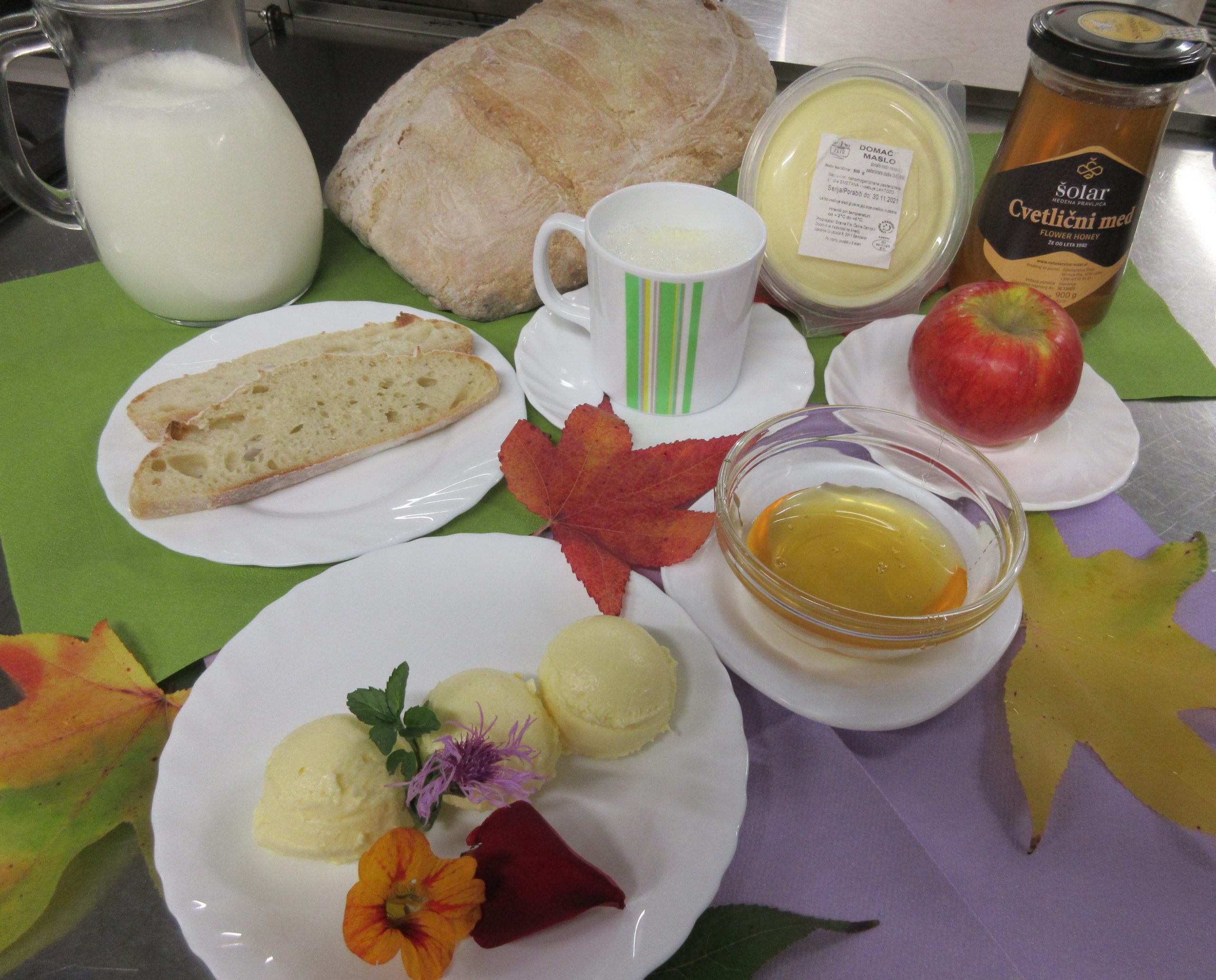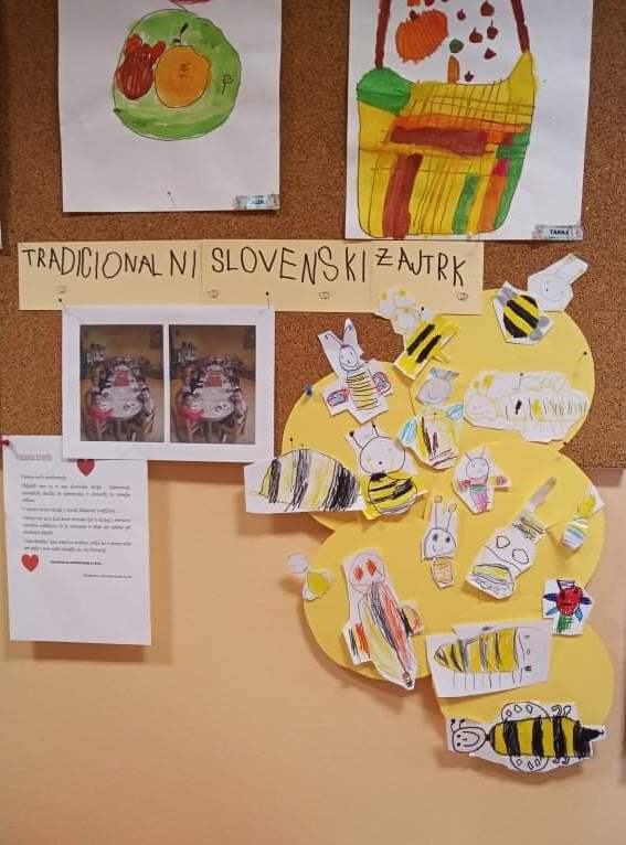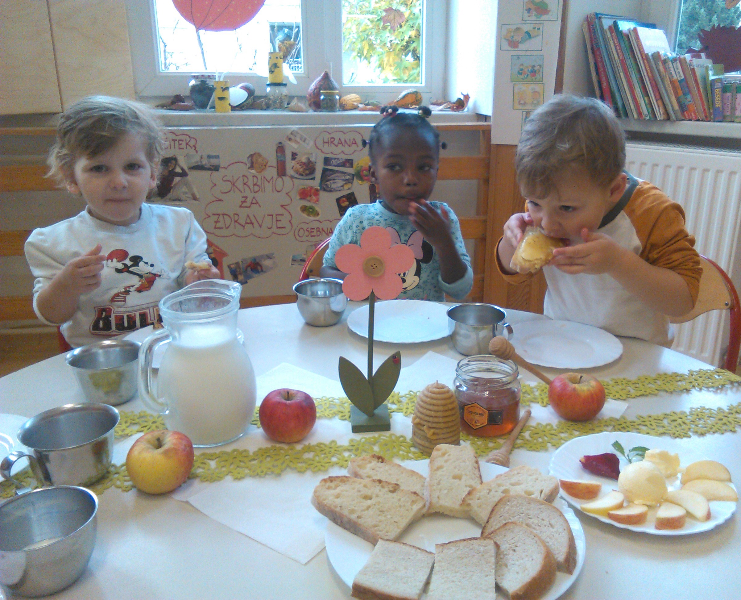 V petek, 19. novembra 2021, smo obeležili Dan slovenske hrane – Tradicionalni slovenski zajtrk. Medeni zajtrk je nastal s ciljem osveščanja o pomenu čebel in prednostih lokalno pridelanih živil. Ker je leto 2021 razglašeno kot mednarodno leto sadja in zelenjave smo v dejavnosti vpletli tudi pomen in vlogo domačega sadja in zelenjave. Na ta dan smo otrokom in zaposlenim za zajtrk ponudili med, kruh, maslo, mleko in jabolka pridelana na slovenskih kmetijah.