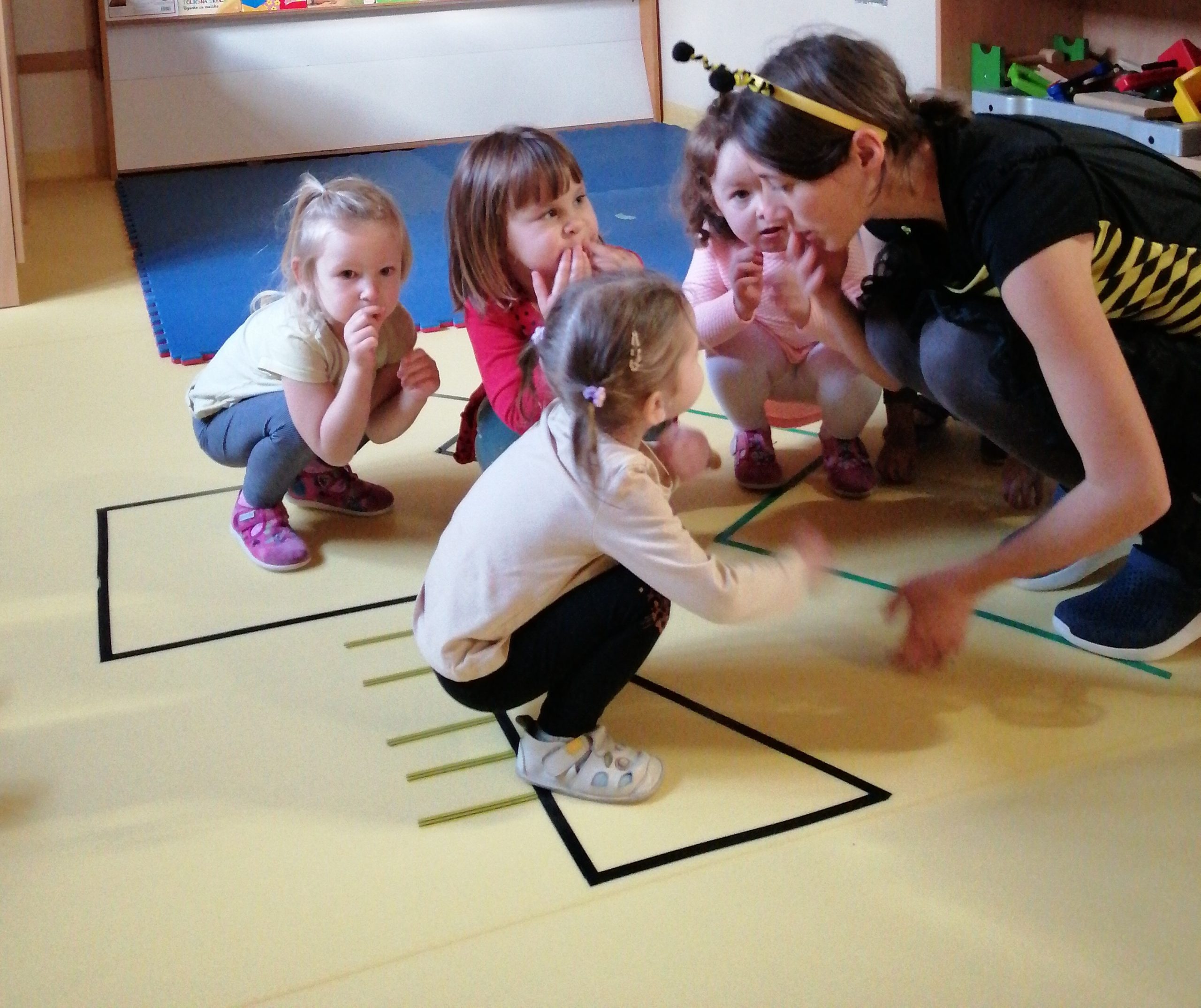 - z likovnim in plesnim izražanjem, s petjem pesmi