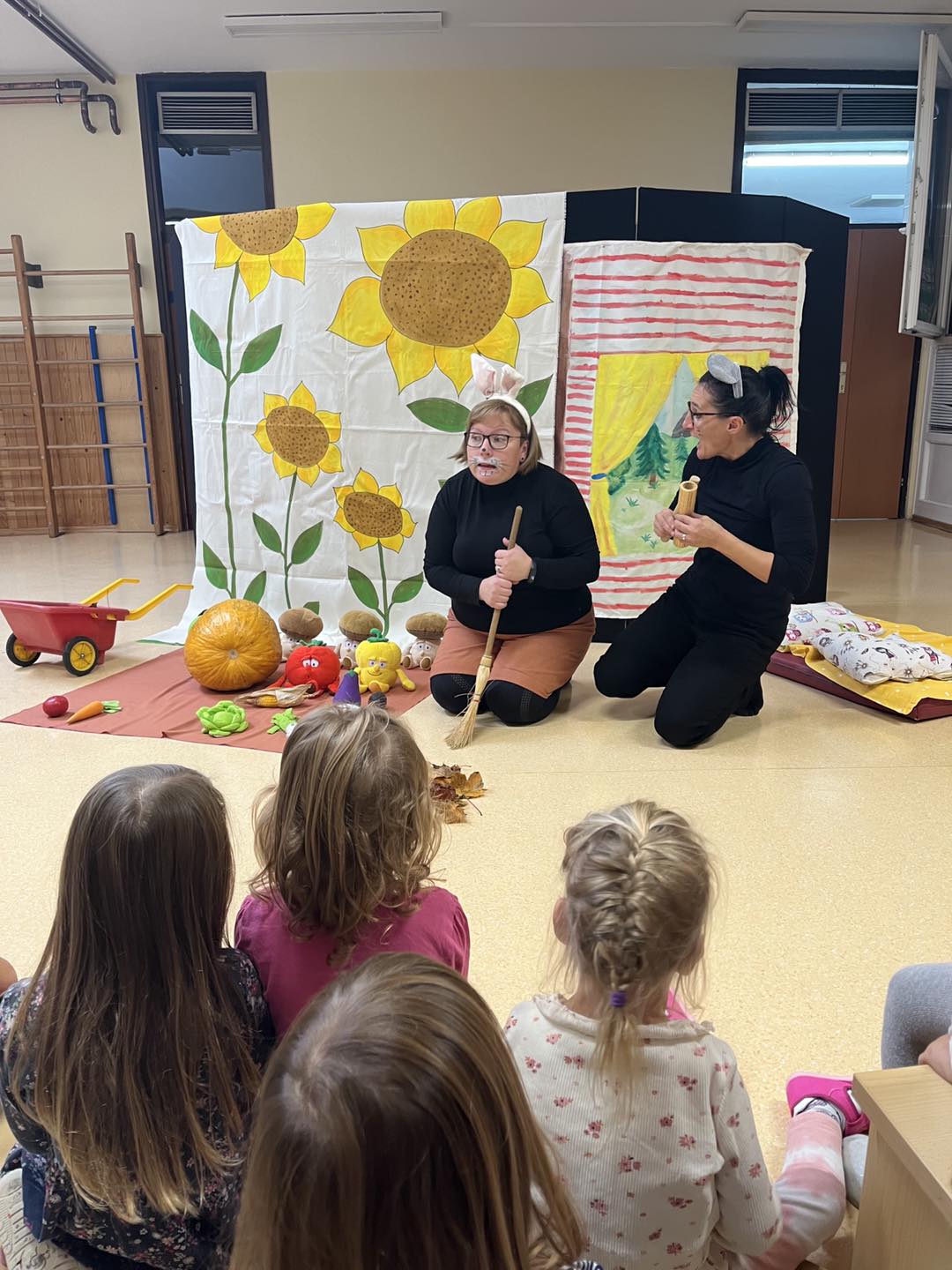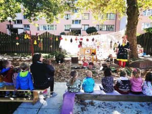 Razvijali smo skupinsko in skupno branje pod krošnjami dreves, v šotorih, v kotičkih, si ogledali različne lutkovne in dramske igre v izvedbi strokovnih delavk. V skupinah smo prepevali pesmi z jesensko tematiko ter se družili, rajali in se imeli dobro.
