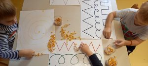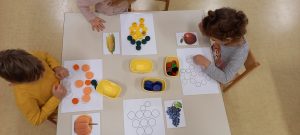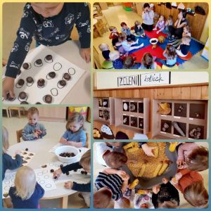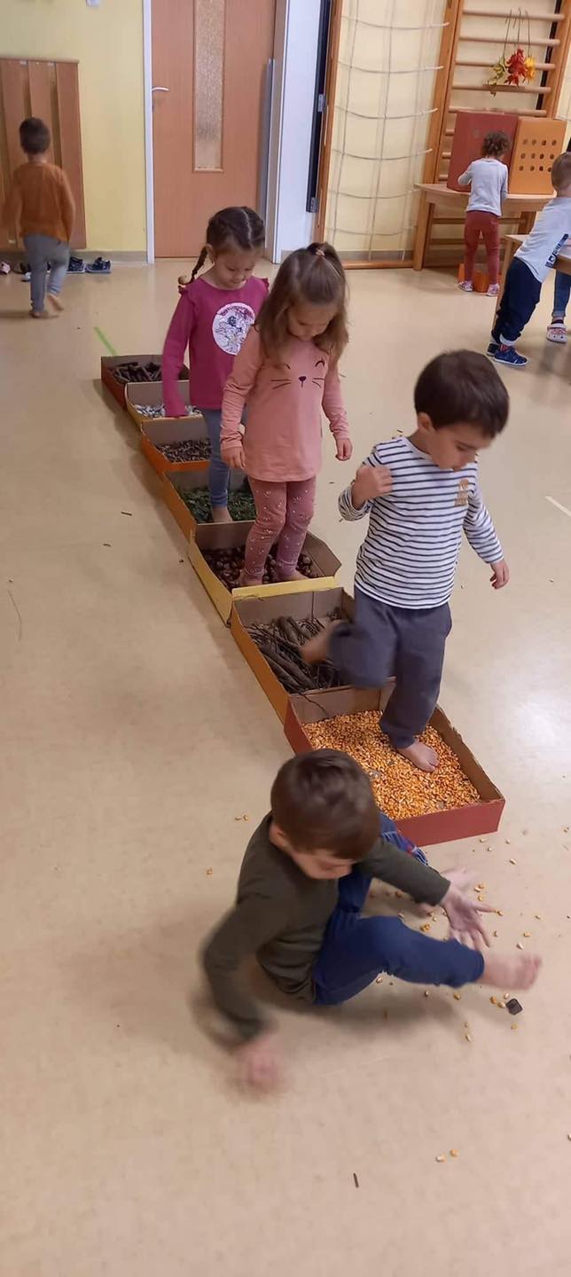 V enotah smo si pripravili pestre in zanimive dejavnosti. Igrali in ustvarjali smo se z jesenskim in nestrukturiranim materialom, hodili po čutni poti, kotalili in prenašali buče ter se igrali različne didaktične igre izdelane iz odpadnega materiala.