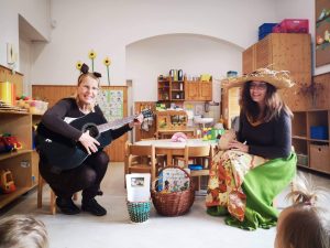 Skozi pesmi, zgodbe in uganke smo spoznali, da listje barva tetka Jesen. O tem smo se prepričali, ko nas je končno obiskala. Odeta v pisane barve nam je pripovedovala zgodbe in predstavila polno košaro jesenskih pridelkov. Skupaj smo prepevali pesmi ob spremljavi kitare, za malico pa nam je pripravila pečen krompir, slastna pečena jabolka in pečene kostanje. Komaj čakamo, da pride spet med nas.