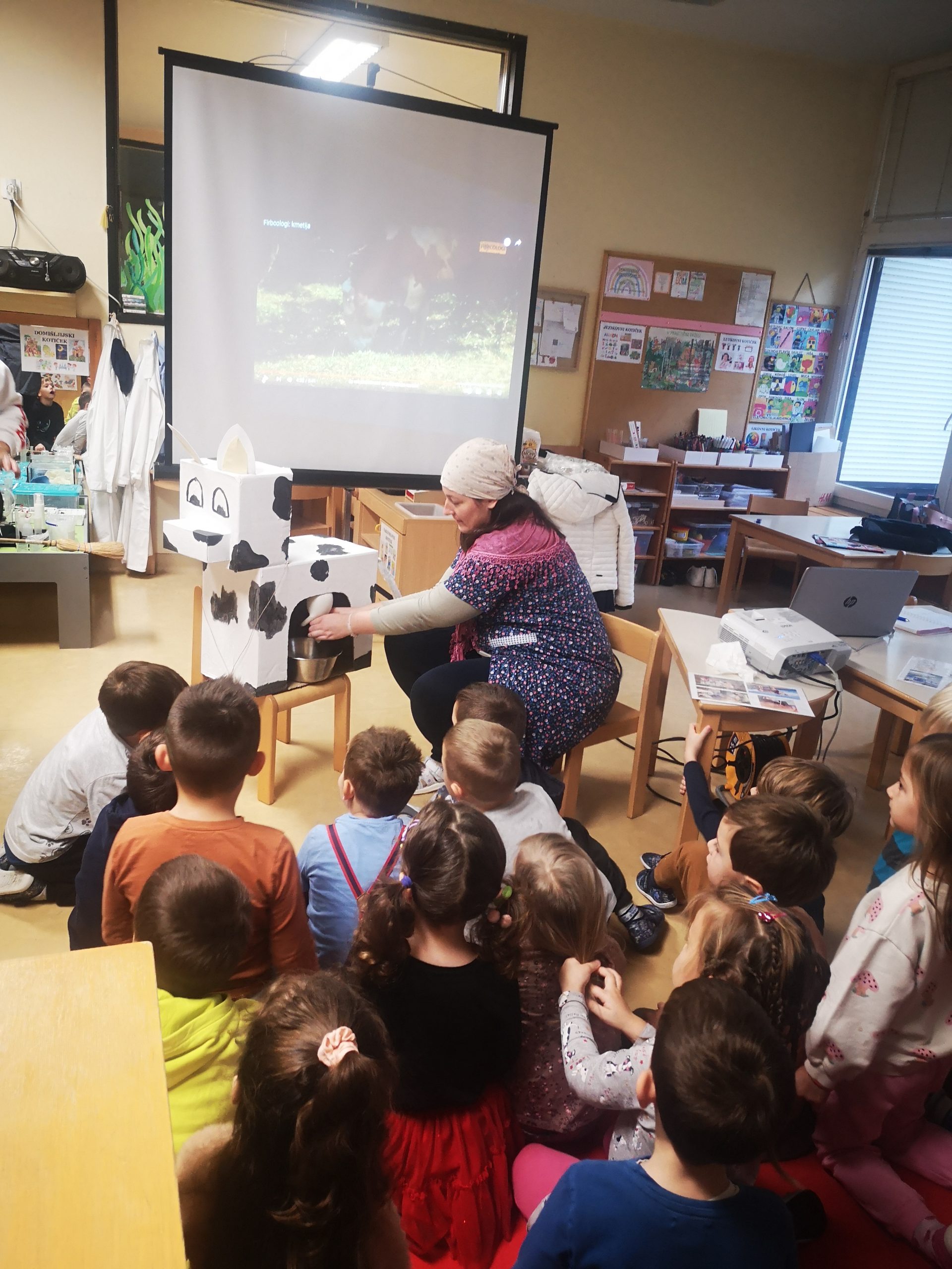 - z ogledom video posnetka o čebelah in molži krave,