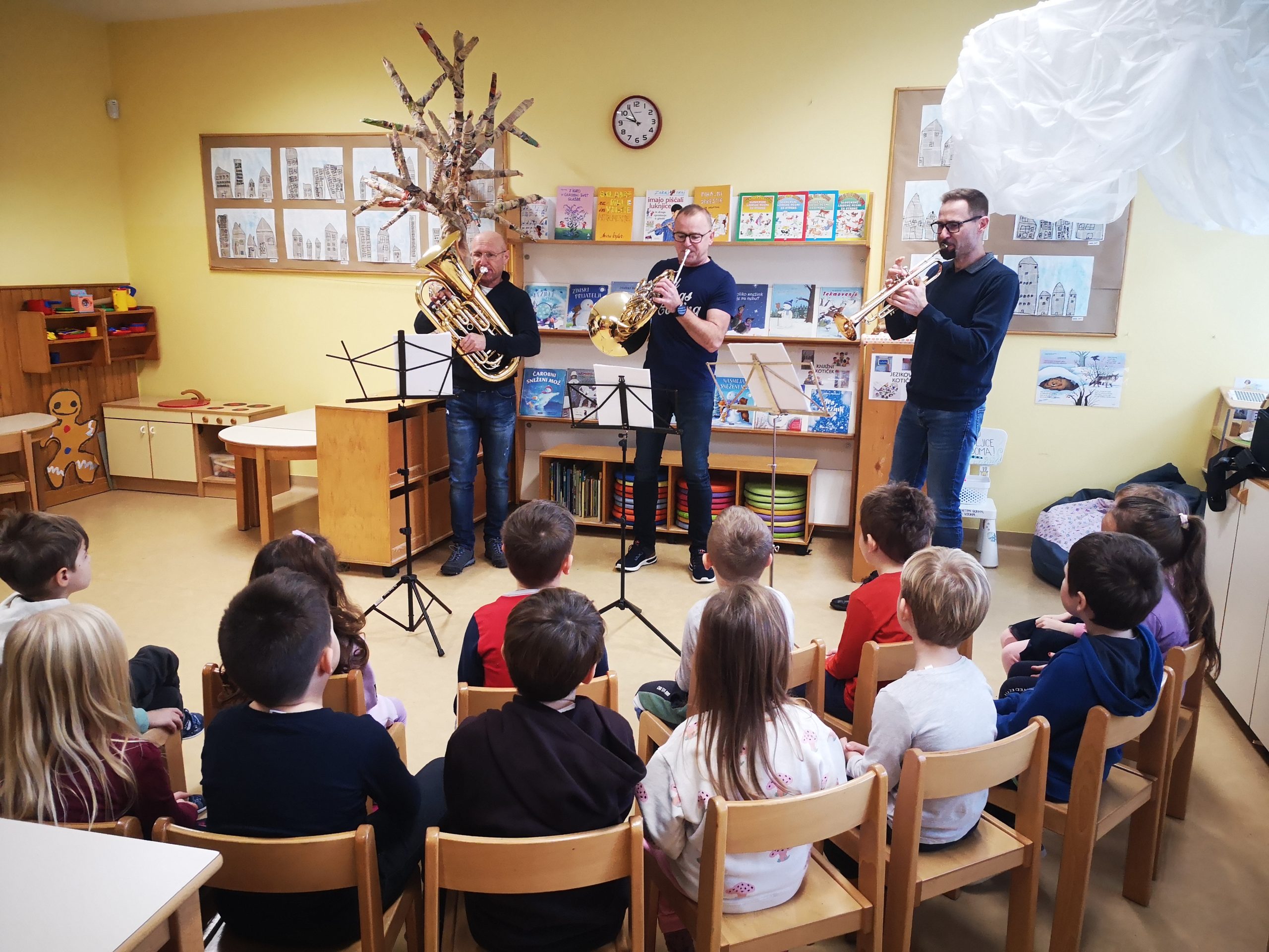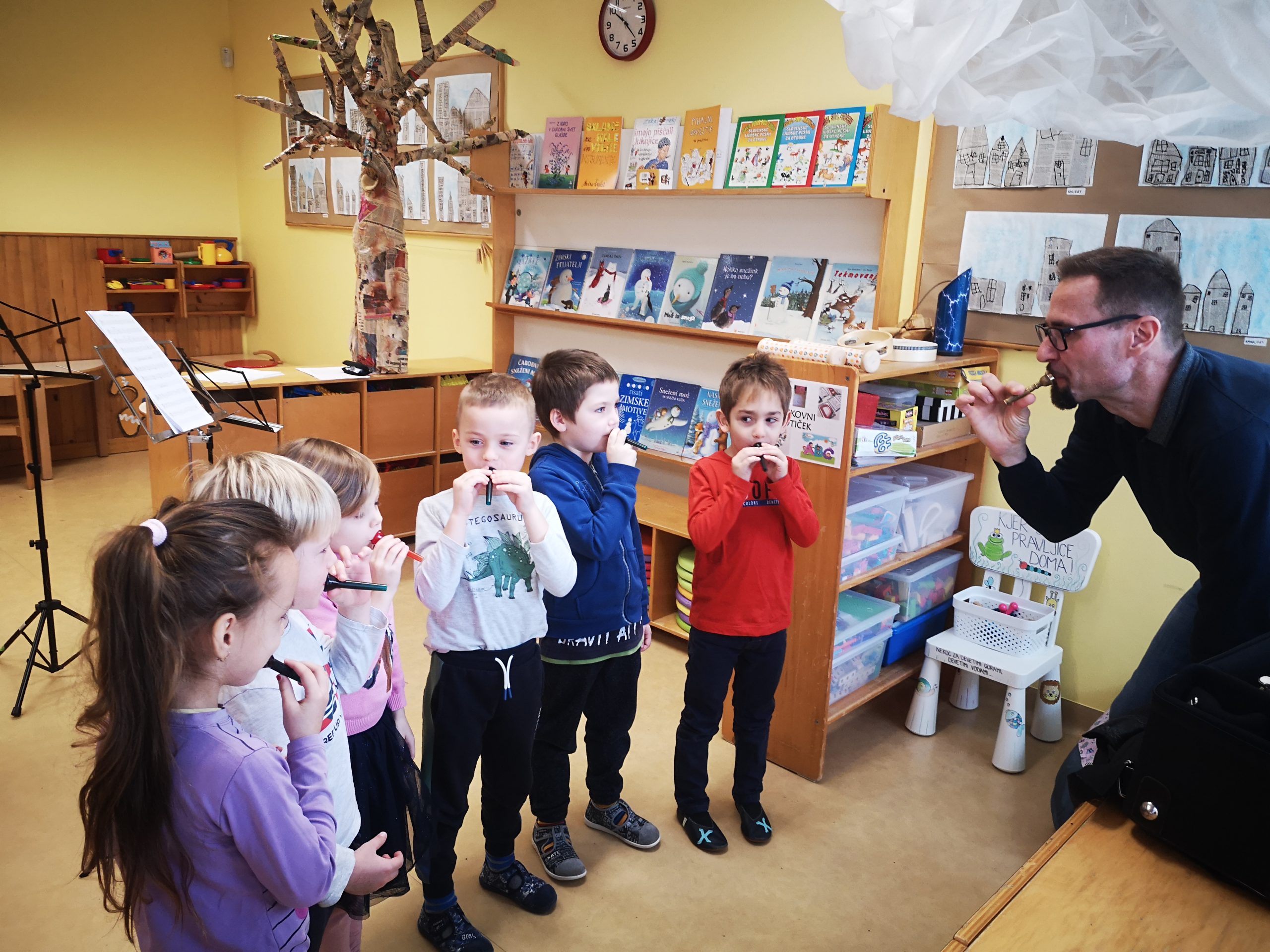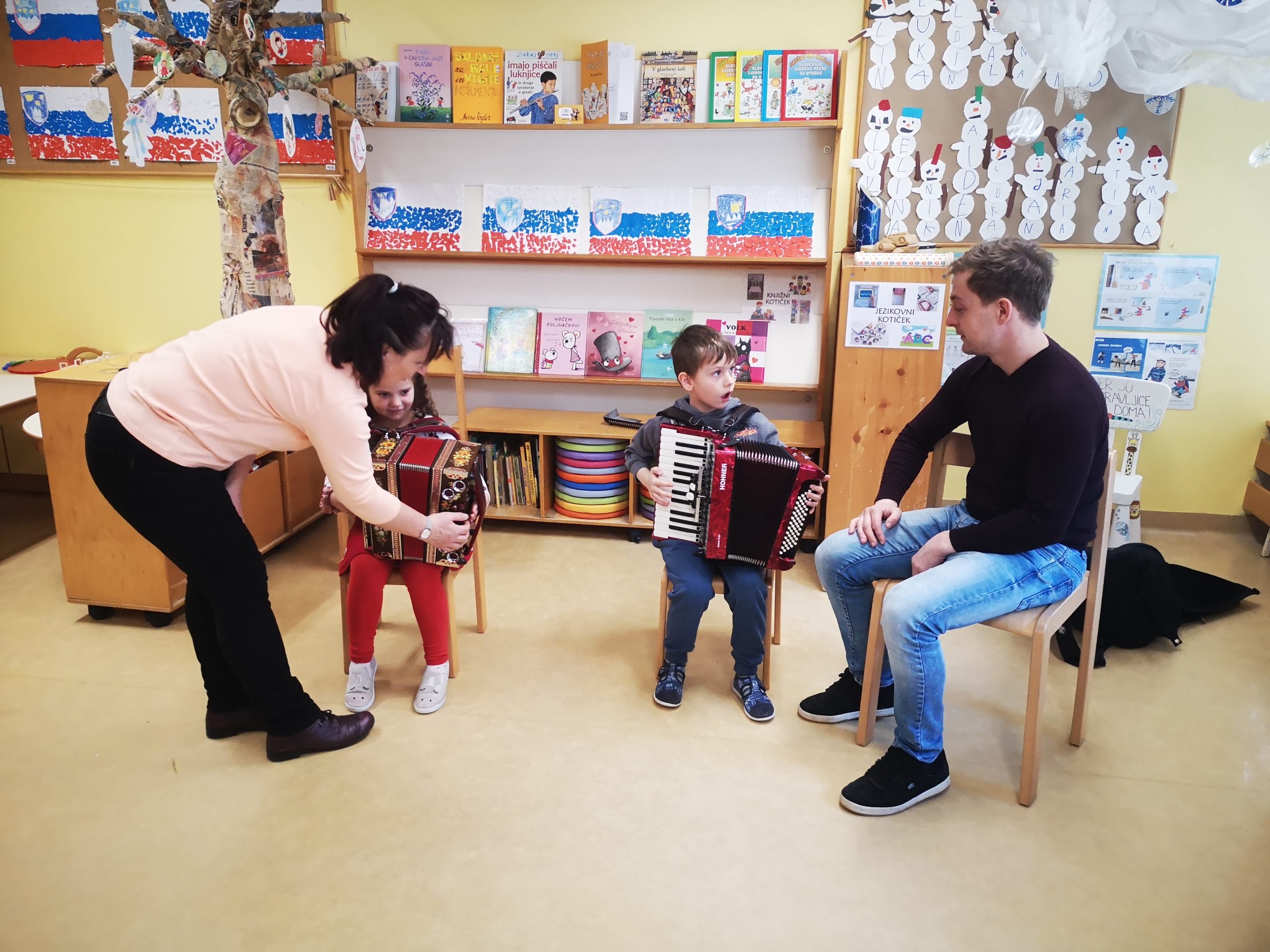 Izjemno smo veseli celoletnega sodelovanja z ravnateljem Glasbene šole, gospodom Simonom Mlakarjem in s profesorji, ki so otrokom na zanimiv način predstavili različne, otrokom manj znane instrumente: trobento, pozavno, rog, tubo, fagot, oboa, harmoniko, citre in še mnoge druge. Otroci so jim z navdušenjem prisluhnili, prepevali ob njihovi spremljavi in se preizkusili v igranju na instrumente.