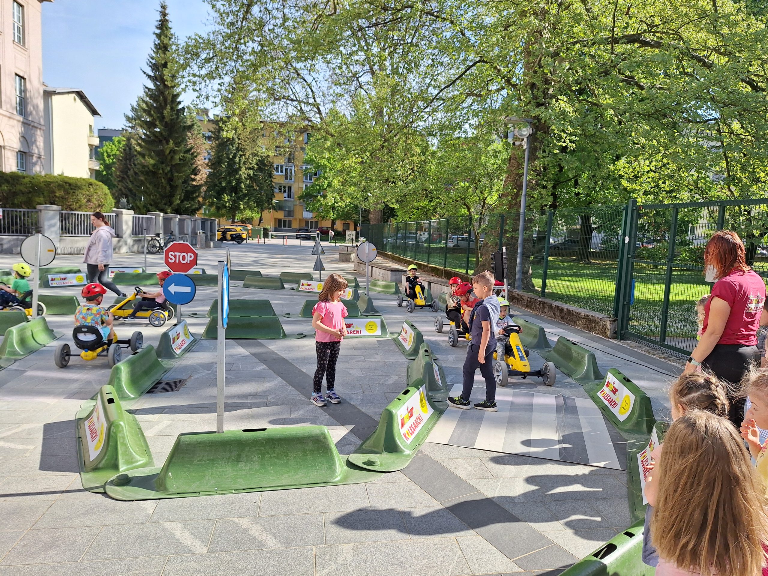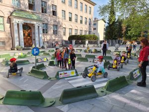 Otroci so se seznanili z osnovno kulturo v cestnem prometu, gibanjem ob cesti oz. po prometnih površinah, s prečkanjem ceste in prometnimi znaki ter z njihovim pomenom. Otroci so se po poligonu popeljali s štirikolesniki na pedala. Postavljenih je bilo več križišč, prehodov za pešce, prometnih znakov in semafor.